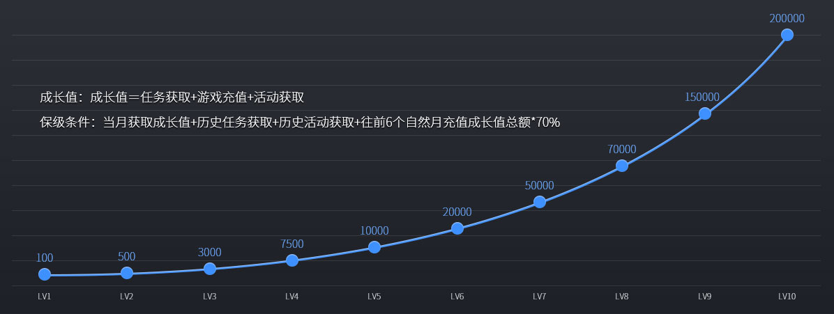 保级条件:当月获取成长值=历史任务获取+历史活动获取+往前6个自然月充值成长值总额*70%